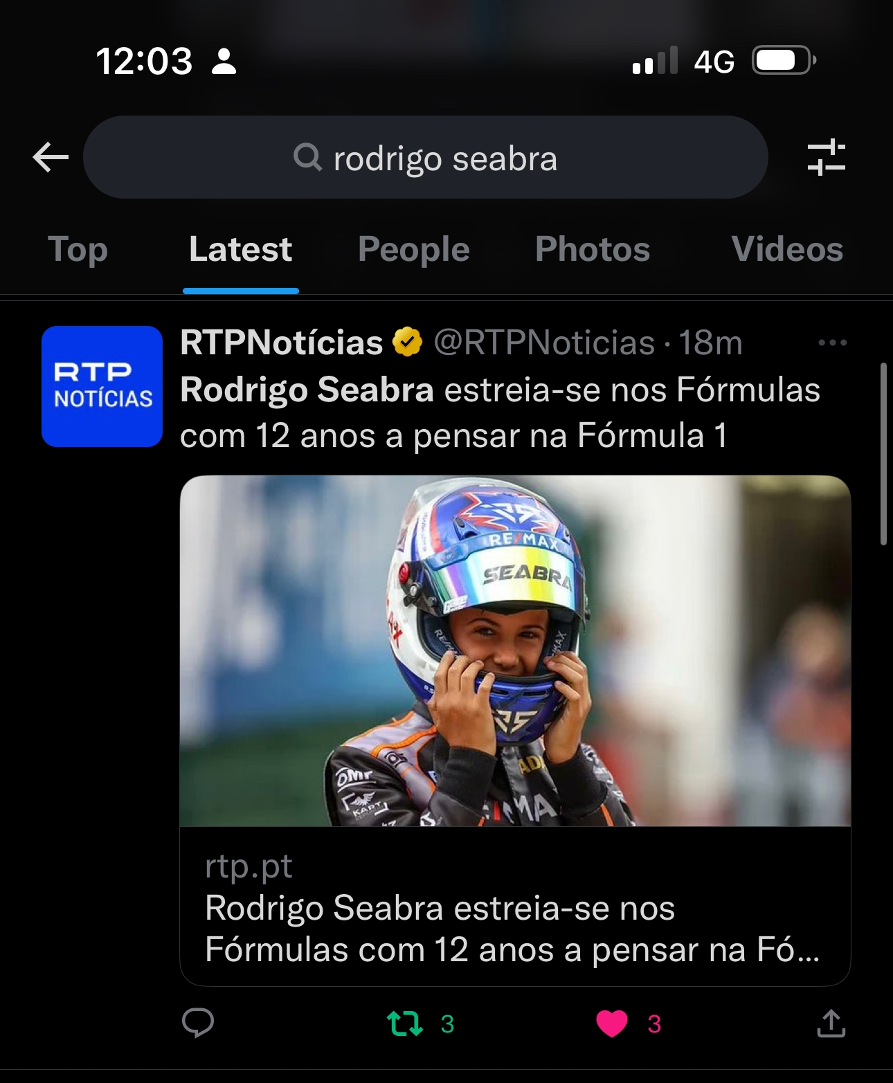 Rodrigo Seabra foi o primeiro piloto português a competir nos Fórmulas com apenas 12 anos, assinalando um marco histórico no desporto motorizado nacional e europeu.